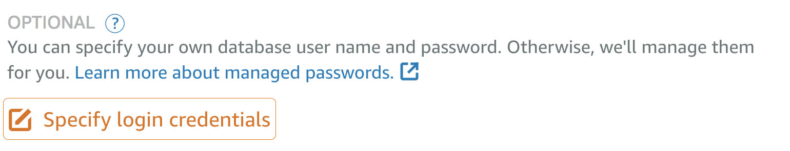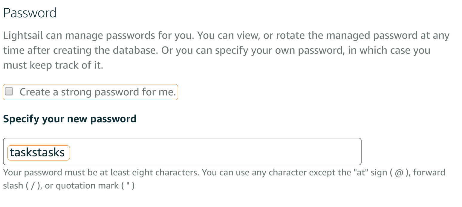 By default Lightsail will create a strong password for you. However this password can contain characters that making copying and pasting difficult, so for this lab we’re going to specify a password. To do this first click Specify login credentials