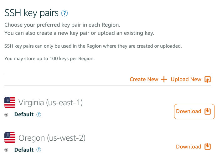 3) You will see a list of available keys. Lightsail will create a default key for any region in which you’ve previously deployed an instance. Choose the key you wish to use and click Download - make a note of where the .pem file was downloaded